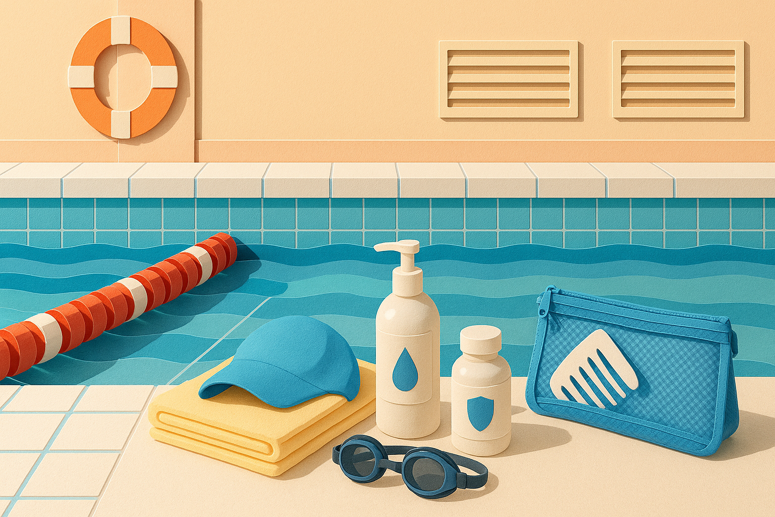 Abspülen – Anti‑Chlor‑Cleanser (Haar/Körper) – sanftes Shampoo/Conditioner – abtrocknen – reichhaltig cremen – ggf. Sonnencreme neu.