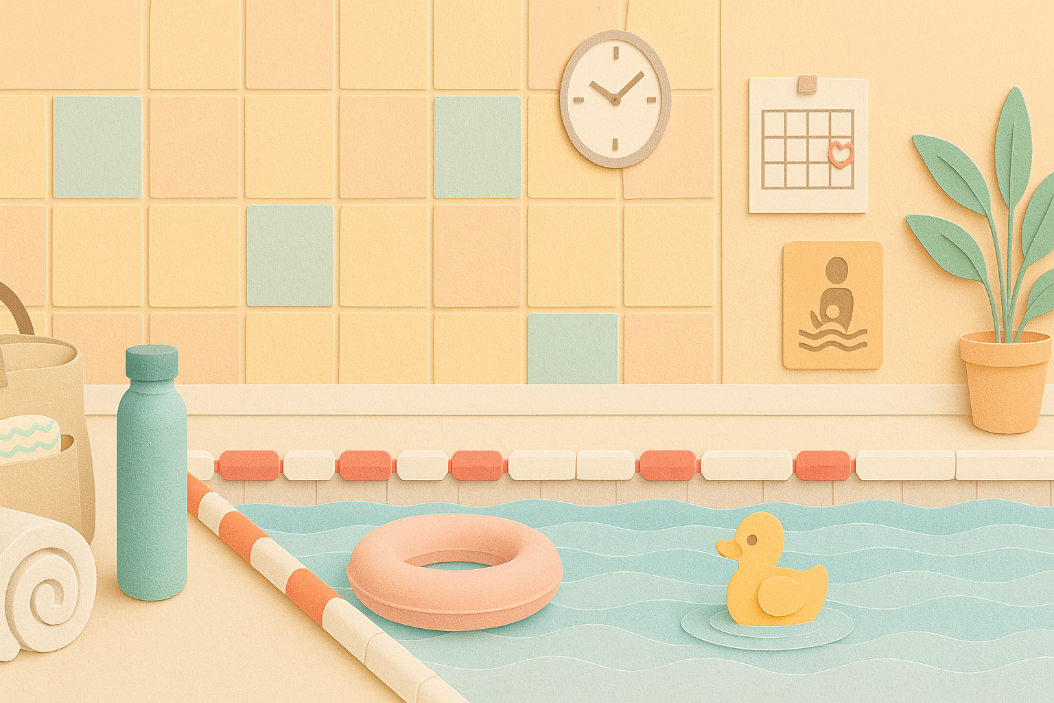 - Tasche packen: Schwimmwindel, zwei Handtücher (eins fürs Einwickeln, eins zum Trocknen), Mütze für danach, kuschelige Kleidung, dein Badeanzug/Bikini, ggf. Bademantel, Wasserflasche, kleiner Snack.