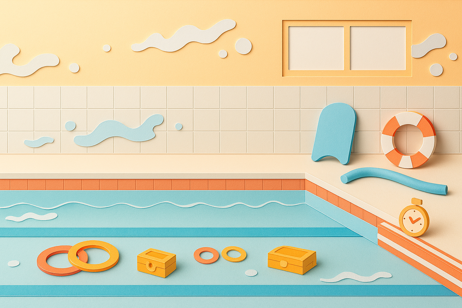 - Bunte Ringe, Markierungen am Beckenrand, „Checkpoints“ nach 3, 5, 8 Sekunden Gleiten. Fortschritt wird messbar und fühlbar.