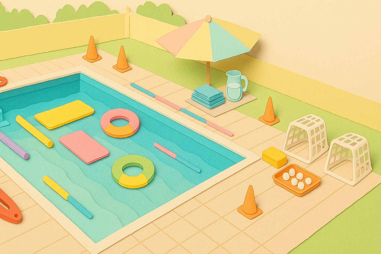 - Spiele-Zubehör: Poolnudeln, Bälle (weich), Tauch- oder Schwimmringe, große Schwämme, Wäschekörbe/Eimer, Markierungskegel, Tischtennisbälle.
