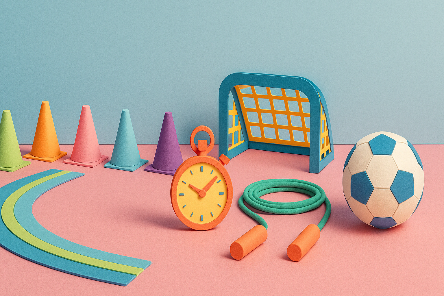 - Ballsport: Passen in Bewegung, Dribbling‑Slalom, 1‑gegen‑1 auf Mini‑Tore