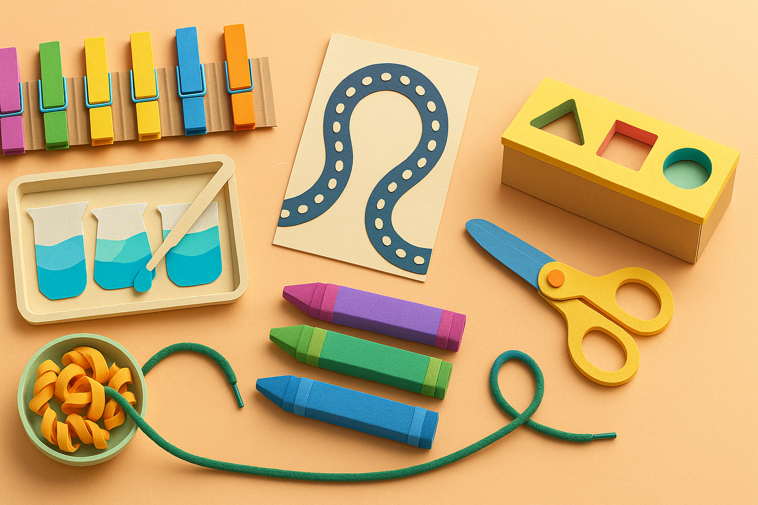 - Kindergarten/Vorschule (3–6 Jahre): 10–15 Minuten, 4–6 Mal/Woche. Fokus: Pinzettengriff, Dosieren (Tropfer/Pipette), Schrauben/Drehen, Schere, Stifthaltung, Linien nachfahren.